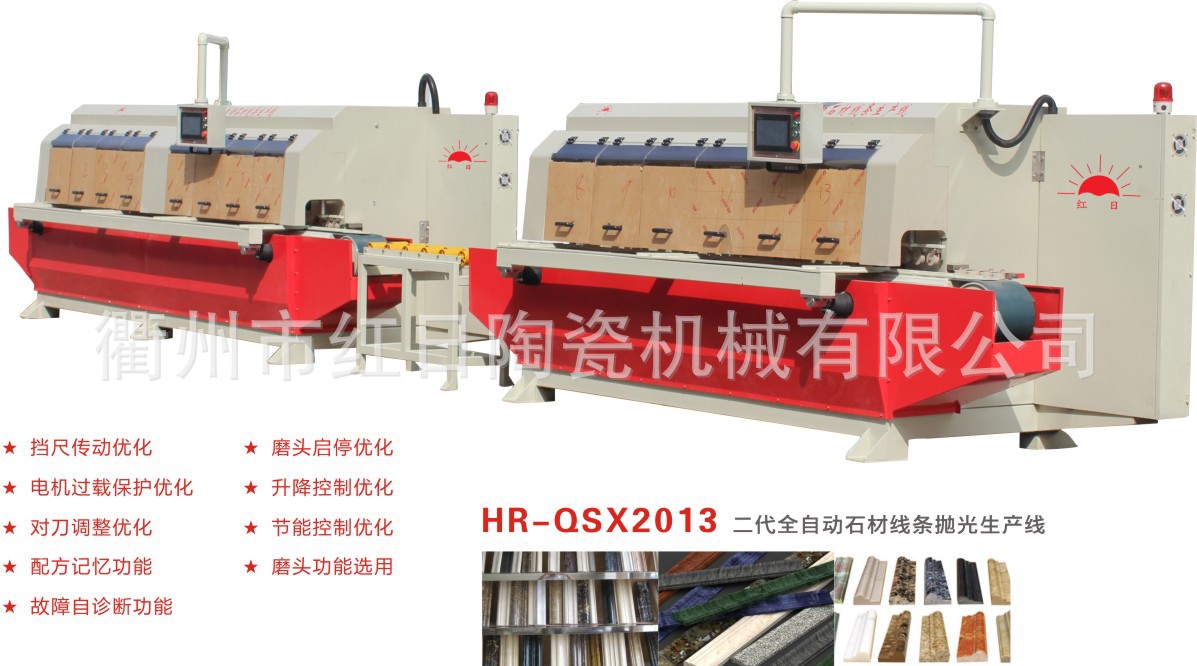 紅日牌全自動線條生產線是我廠在多年制造石材機械和陶瓷機械的豐富經驗基礎上,改良研制出來的陶瓷和石材深加工機械。適用于陶瓷、大理石、花崗石等不同材料,在可設定程序的微機協(xié)助下,全自動生產各種形狀的裝飾線條。相對于傳統(tǒng)的手工或半機械加工方式,取得突破性的提高,具有生產效率高、產品質量好、加工成本低等許多新優(yōu)勢。