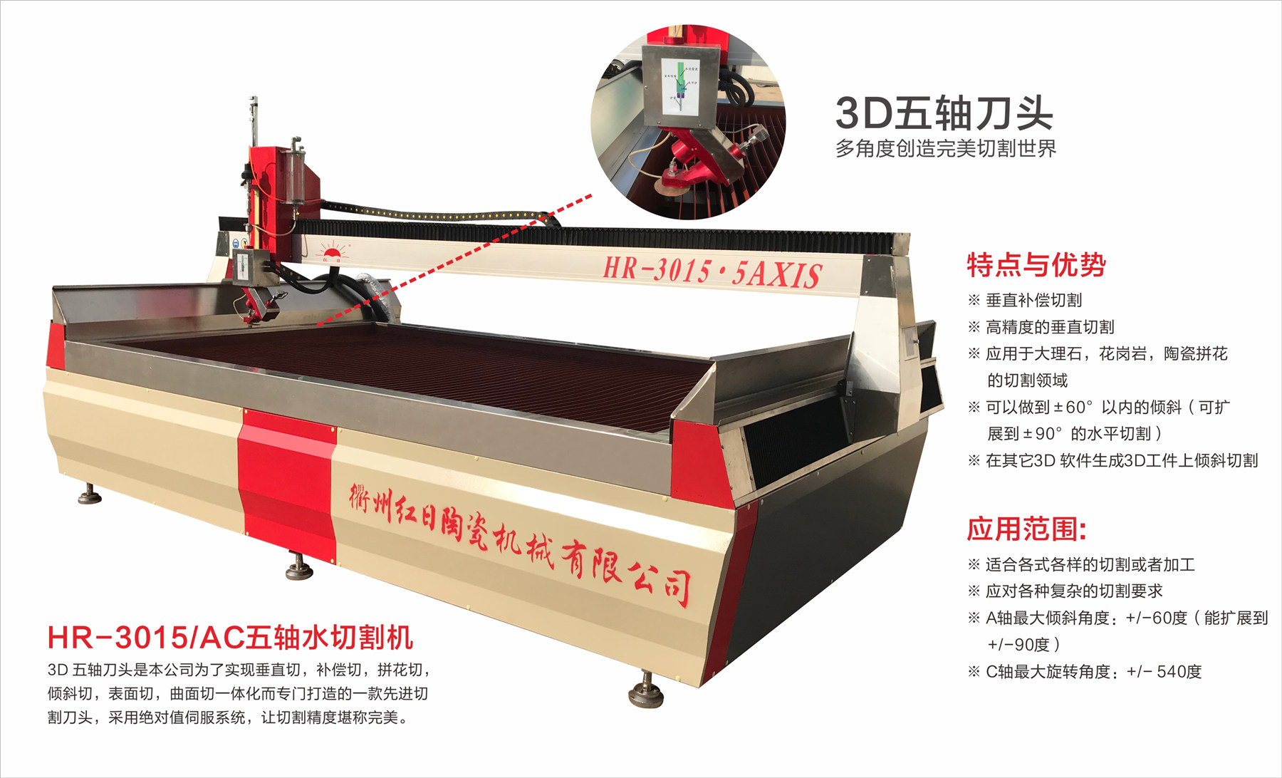 AC五軸水刀是本公司為了實(shí)現(xiàn)垂直切,補(bǔ)償切,拼花切,傾斜切,表面切,曲面切一體化而專門打造的一款先進(jìn)切割水刀,采用絕對(duì)值伺服系統(tǒng),切割精度可達(dá)0.1mm。